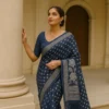 The lightweight georgette fabric falls beautifully, enhancing your silhouette while keeping you comfortable throughout the day or evening. The silver foil printed motifs add a tasteful festive sparkle that catches the light without overpowering the look. Its rich blue tone conveys calm elegance and sophistication, making it suitable for weddings, festive gatherings, poojas, and evening parties.