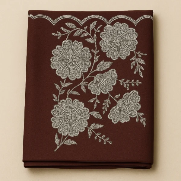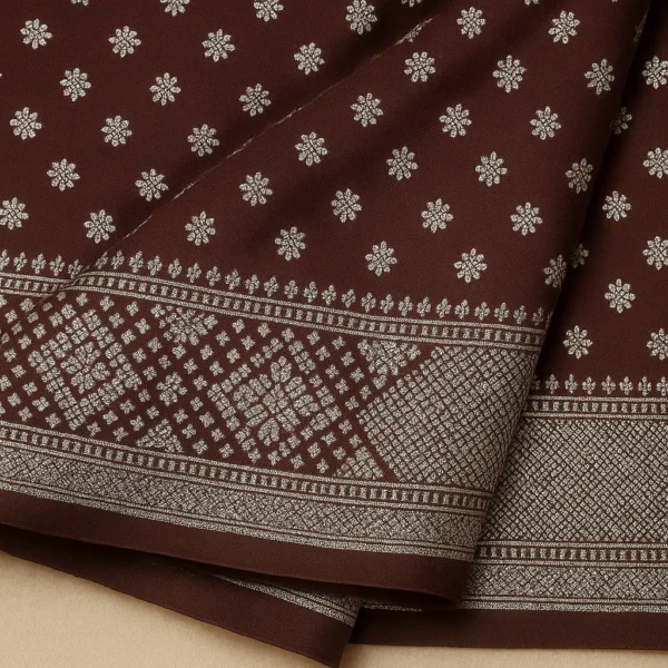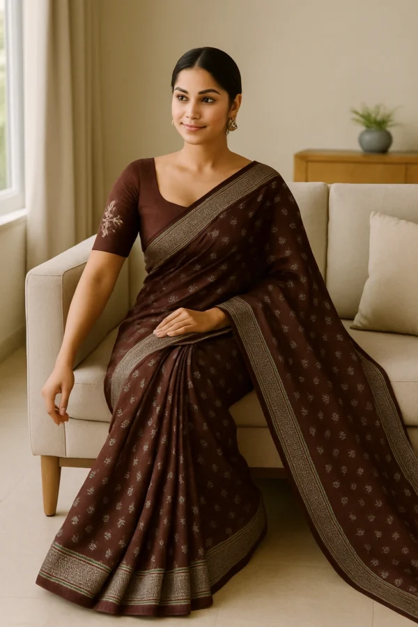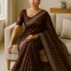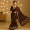 Crafted from lightweight georgette, the saree drapes smoothly and flatters your silhouette while keeping you comfortable all day or evening. The silver foil printed motifs add a soft festive glow that catches the light beautifully, giving the saree a premium yet balanced appeal. The warm brown shade offers a sophisticated alternative to bright colors—perfect for those who love subtle, classy fashion.