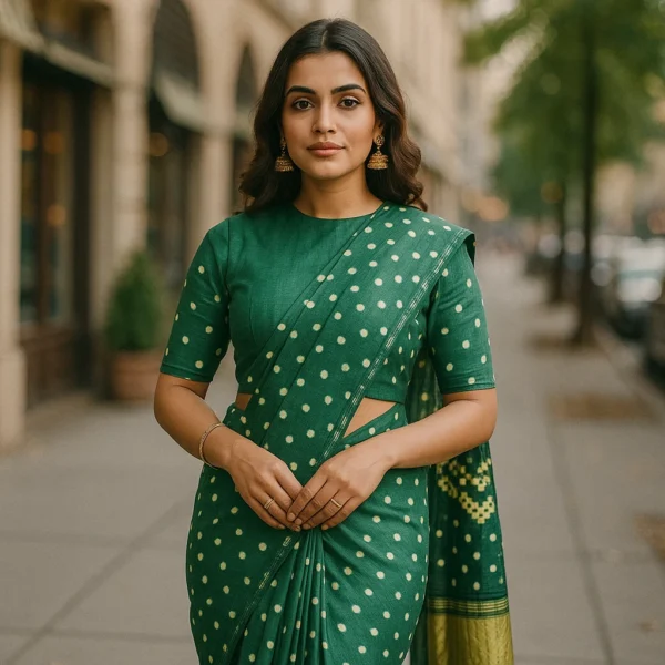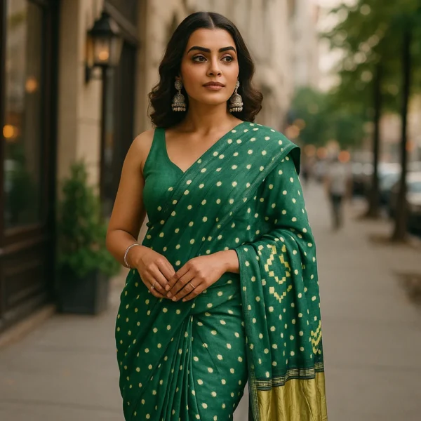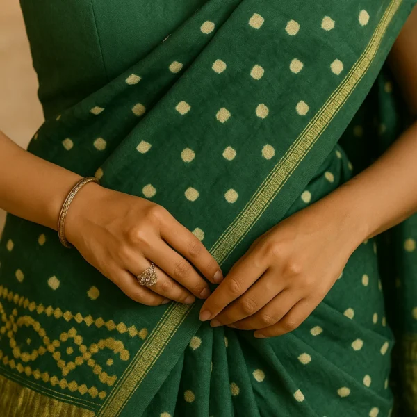 The deep emerald tone reflects prosperity and calm, while the golden border adds a regal glow. The drape is smooth and fluid — light enough for comfort, rich enough for admiration.