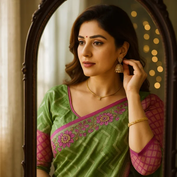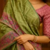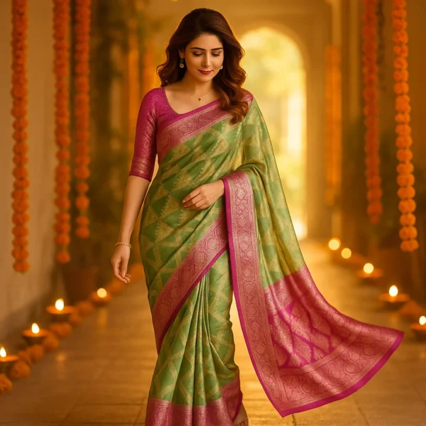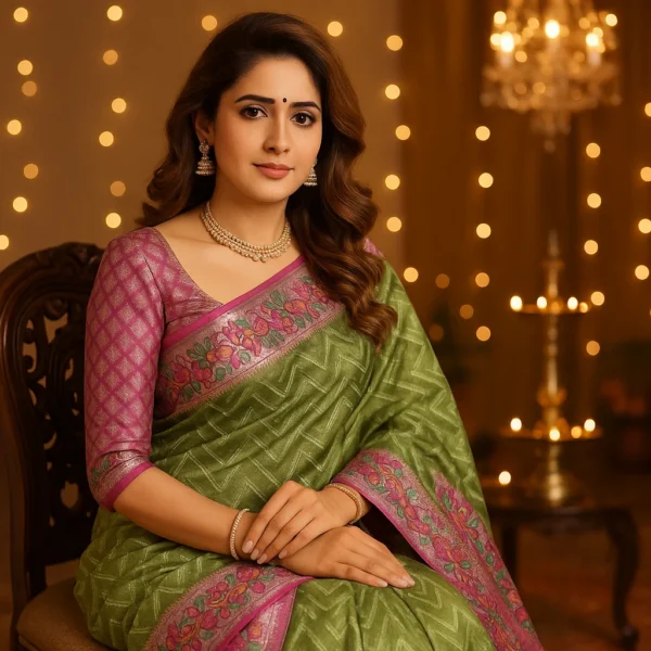 Unlike heavy silks, Kora Silk is light, breathable, and easy to carry, yet it carries the richness of a true Banarasi weave. The combination of soft green and vibrant pink zari border creates a timeless contrast — proof of fine craftsmanship and aesthetic balance.