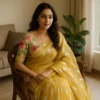 As seen in the images, the saree features a soothing mustard yellow tone enhanced with delicate silver motifs, adding just the right amount of visual interest without overpowering the look. The highlight is the floral Chikan embroidered blouse, inspired by timeless handcraft traditions, which lends elegance and femininity to the ensemble.