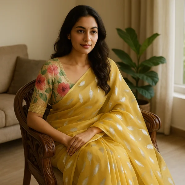 This Mustard Yellow Chiffon Saree with Chikan Blouse is designed for women and girls who prefer subtle richness over heavy ornamentation. The soft chiffon fabric falls fluidly, creating a graceful silhouette that feels light, breathable, and comfortable throughout the day.