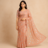 The saree is paired with an elegantly detailed Chikan embroidered blouse, inspired by traditional craftsmanship that adds refinement without heaviness. The soft peach shade enhances natural skin tones and brings a gentle glow to your look, making it ideal for day celebrations, festive gatherings, office wear, poojas, brunches, and summer occasions.