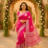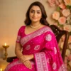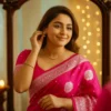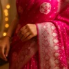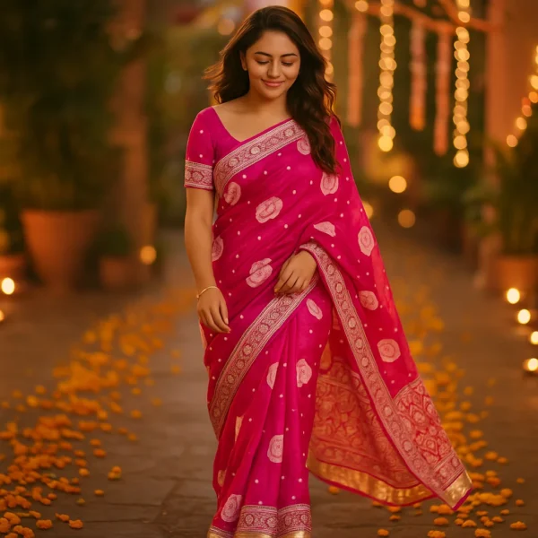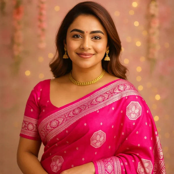 Unlike heavier silks, this Banarasi Katan Silk saree offers a rich traditional look while staying light and easy to drape. The bright pink shade radiates festivity and grace, while the silver zari weaving adds a refined, luxurious glow — proof of authentic Banarasi craftsmanship.