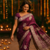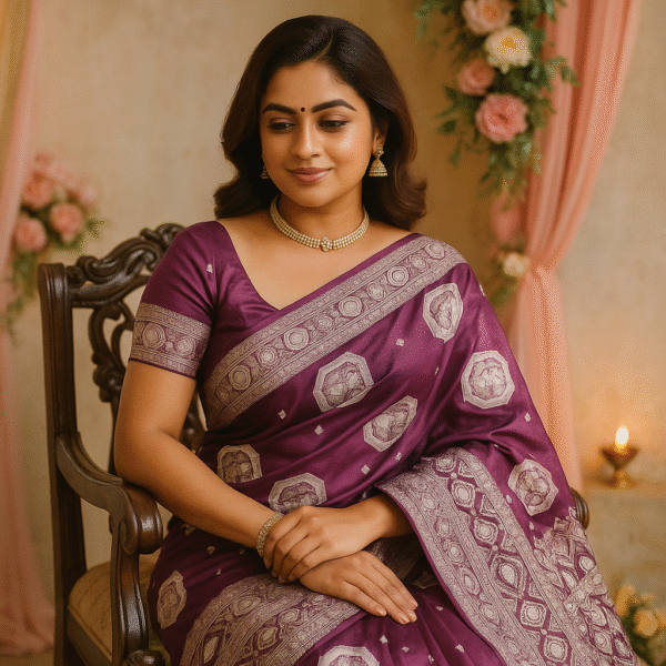Made from premium Banarasi Katan Silk, it delivers a naturally lustrous finish without the stiffness or weight of heavier silks. The deep purple tone reflects festive richness, while the fine silver zari weaving adds a subtle, royal shimmer — proof of skilled Banarasi craftsmanship.