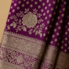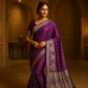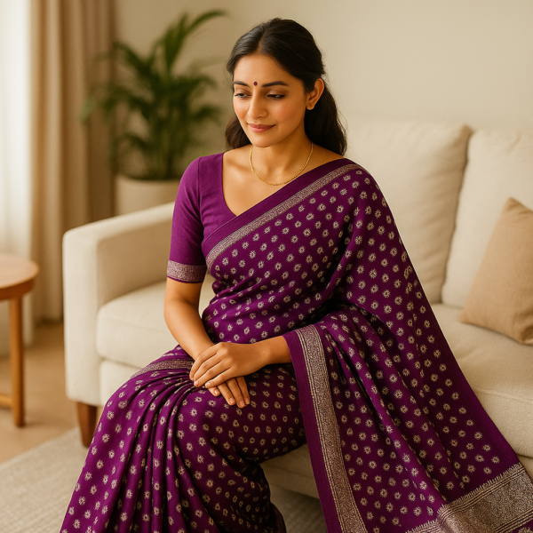 The soft georgette fabric flows naturally, enhancing your silhouette while keeping you light and comfortable throughout the day or evening. The silver foil printed motifs catch the light beautifully, adding a luxurious sparkle that feels festive yet tasteful. Its deep purple shade reflects richness and sophistication, making it ideal for wedding functions, festive gatherings, and elegant parties.