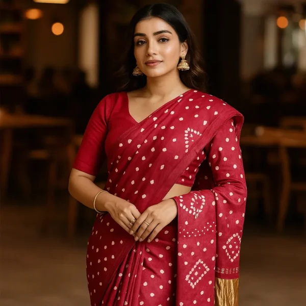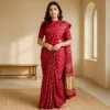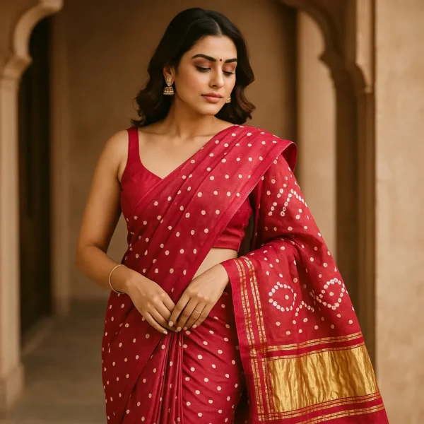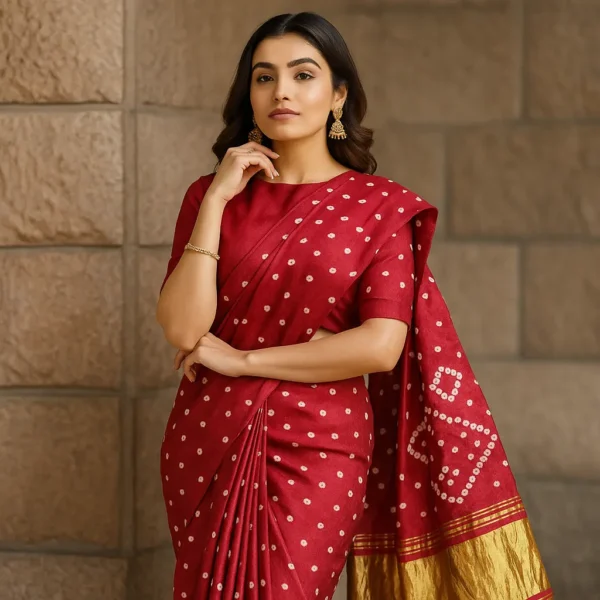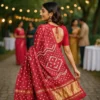 This Red Gajji Silk Bandhani Saree is one such creation — you see it once, and its charm stays with you.